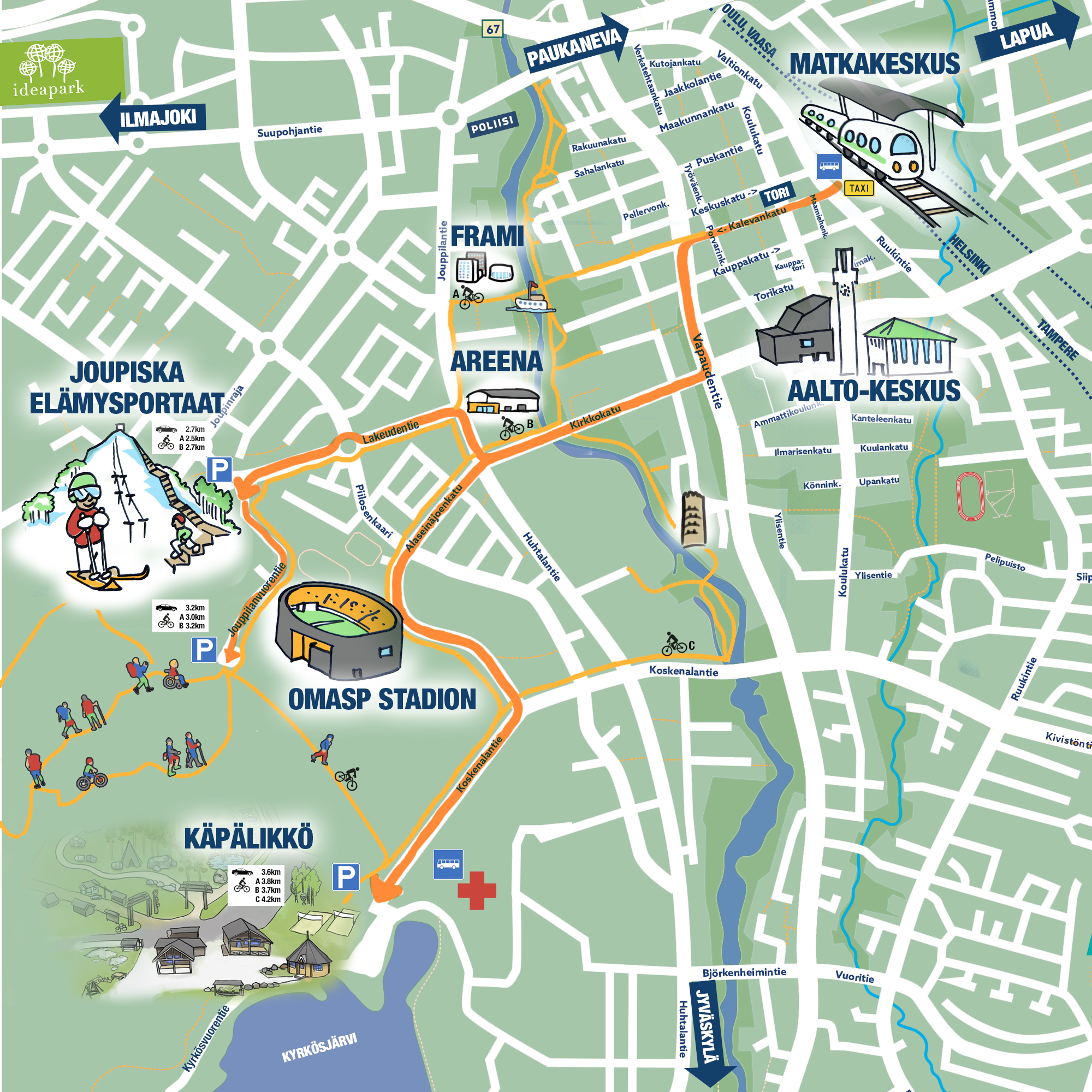 Elämysliikuntareiteille saavut helposti niin julkisella liikenteellä kuin omalla autollakin. Katso tarkemmat saapumisohjeet sekä tärkeät osoitteet Saapuminen -välilehdeltä.
