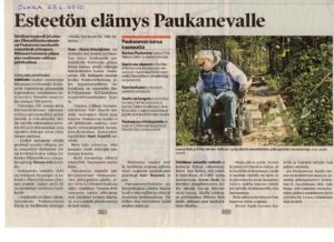 Jaamme Lakeuden Elämysliikunnasta vuosien varrelta kirjoitettuja lehtiartikkeleita. Tämä artikkeli on julkaistu Ilkka Pohjalaisessa 23.6.2010 ja kirjoittajana on toiminut Karoliina Liimatainen. Pääset näkemään alkuperäisen artikkelin tämän sivun lopussa. Esteetön elämys Paukanevalle Seinäjoen kaupunki ja Lakeuden Elämysliikunta rakentavat Paukanevan suoalueelle esteettömät pitkospuut. Rikkaasta luonnosta pääsee pian nauttimaan vaikkapa pyörätuolissa. Seinäjoen seudun esteettömät liikuntamahdollisuudet lisääntyvät Paukanevan pitkosreitin laajennuksen