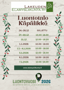 Talven koko perheen tapahtuma Talven perinteinen koko perheen talvitapahtuma su 1.3.2025 klo 13 – 16 Ulkona kuin Lumiukko kutsuu kaikki liikkumaan ja nauttimaan ulkoilmasta. Ohjelma Ohjelmassa on monipuolista tekemistä koko perheelle, ja tapahtuma järjestetään sääolosuhteiden mukaan muokattuna. Lapset ja aikuiset pääsevät nauttimaan luonnon hyvinvointivaikutuksista yhdessä ja kokemaan talven parhaat ulkoiluleikit. Lumenveistoa – luo upeita taideteoksia […]