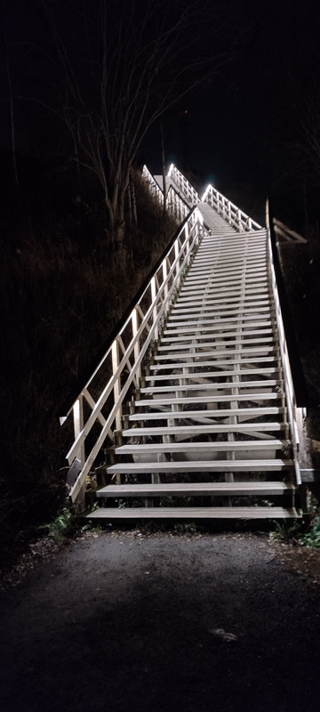 Portaiden puolivälissä on levähdyspaikka, joka toimii myös sadekatoksena. Siellä voit nauttia kahvit tai vain rentoutua luonnon äärellä. Taide tarjoaa visuaalisen elämyksen ja tuo kulttuuria liikuntakokemuksen rinnalle. Kesäisin kauniisti rakennetut portaat kulkevat puiden varjoissa. Jokainen askel vie sinut lähemmäksi huipulla odottavaa palkitsevaa tunnetta.