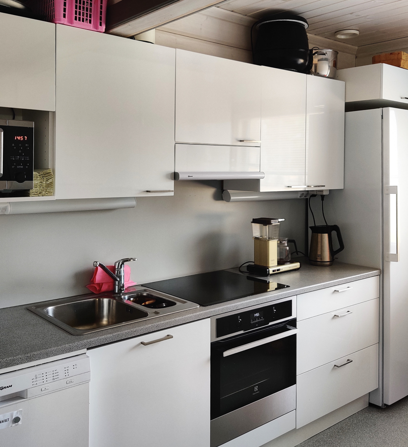 Luontotalon keittiö on hyvin varusteltu, joten tarjoilut hoituvat vaivattomasti paikan päällä. Keittiöstä löytyvät jääkaappi, mikroaaltouuni, astianpesukone ja monipuoliset ruoanvalmistusvälineet, joten voit jättää kaiken meidän huoleksemme.